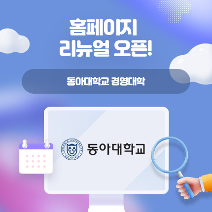메인으로 이동 SNS 목록열기 FACEBOOK 공유하기 TWITTER 공유하기 BLOG 공유하기 SNS 목록닫기 인쇄 url 복사 메인비주얼 도약, 비상 그리고 다우이스트Dong-A University College of Administration 발전기금 발전기금Dong-A University College of Administration 학교사진 Dong-A University College of Administration 이전 장면 다음 장면 정지 재생 공지사항 공지사항MORE 입학정보 취업지원실 국제교류과 학생정보 뉴스레터 오시는길 DONG-A NEWS 기업분석 공모전 더보기 POPUP ZONE 01 이전 장면 정지 재생 다음 장면 DONG-A UNIVERSITY 경영대학 학과소개 동아대학교 동아대학교 경영대학 창의적이고 전문적이며 상호협력적이고 문제해결 중심적 사고를 가진 실용적 경영전문인(DAUist)를 양성합니다 VIEW MORE 테스트1 동아대학교 경영대학의 소식을 알려드립니다. PREV NEXT 정지 재생 보러가기
